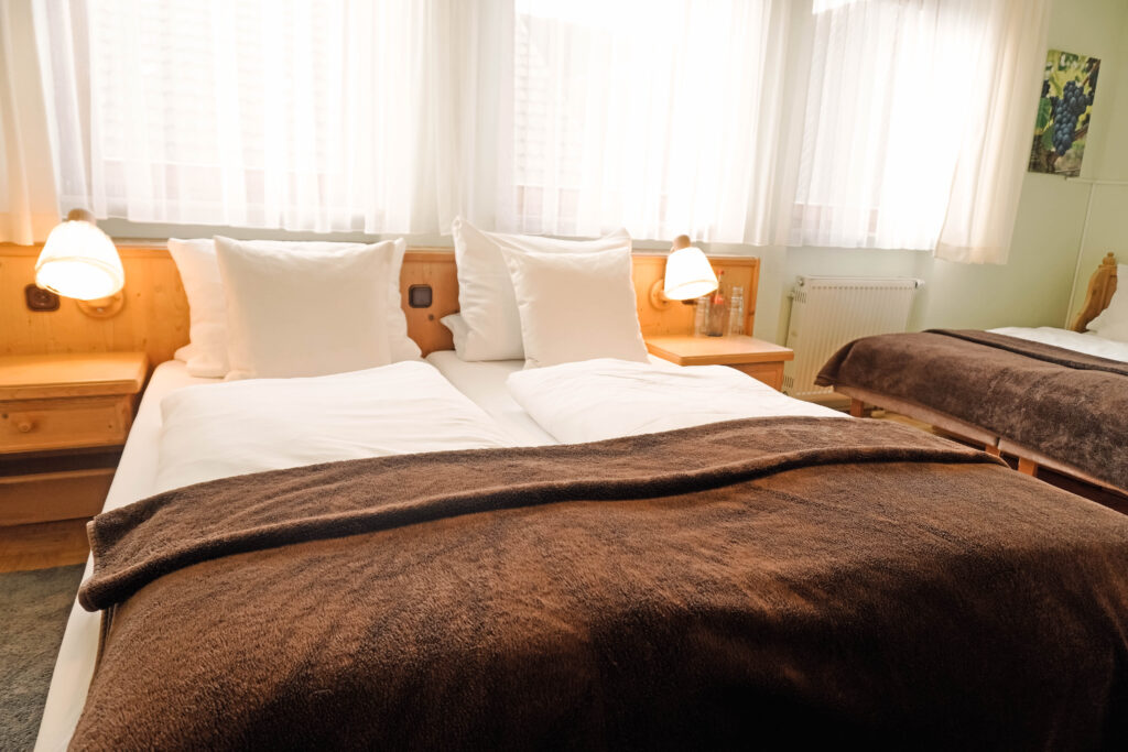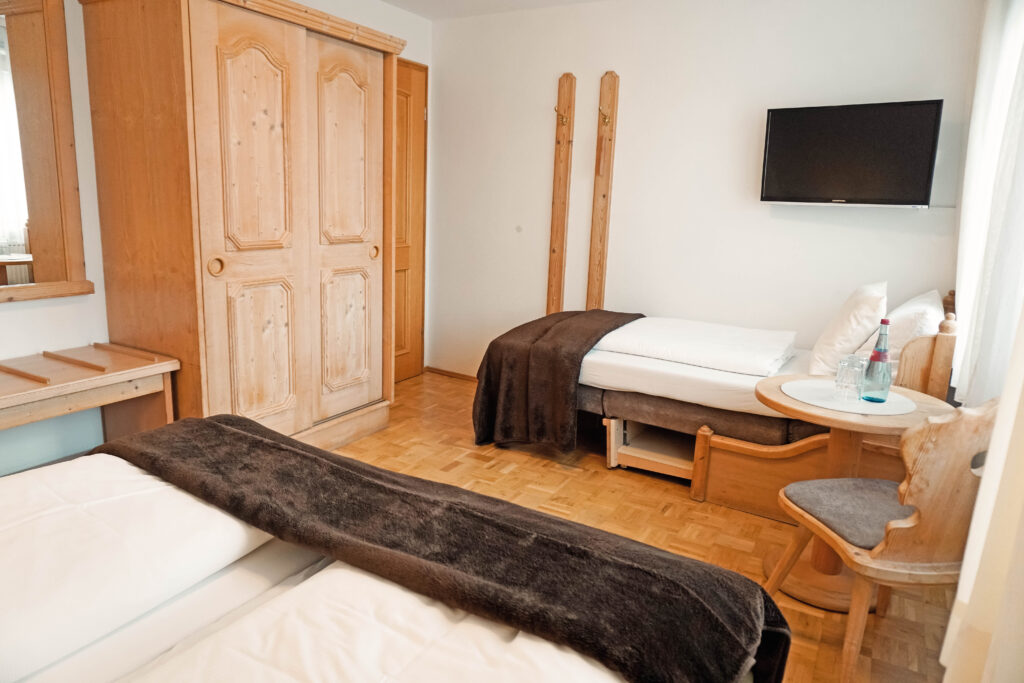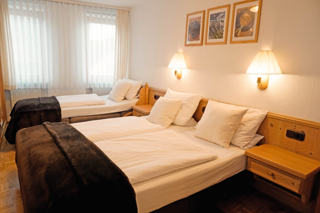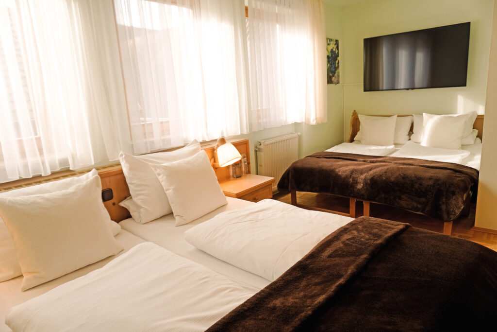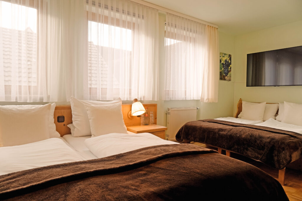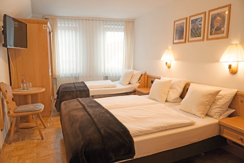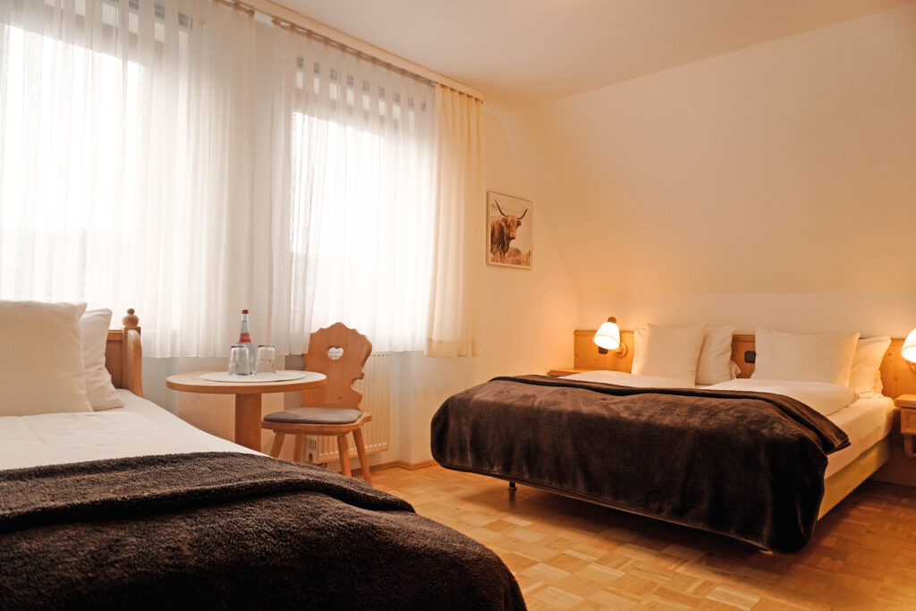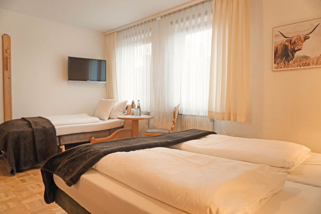 Unsere Mehrbettzimmer basieren auf den Doppelzimmern und sind mit einem oder zwei zusätzlichen Betten buchbar. Sie bieten ausreichend Platz und eine praktische Ausstattung für einen komfortablen Aufenthalt, ideal für Familien oder kleine Gruppen.