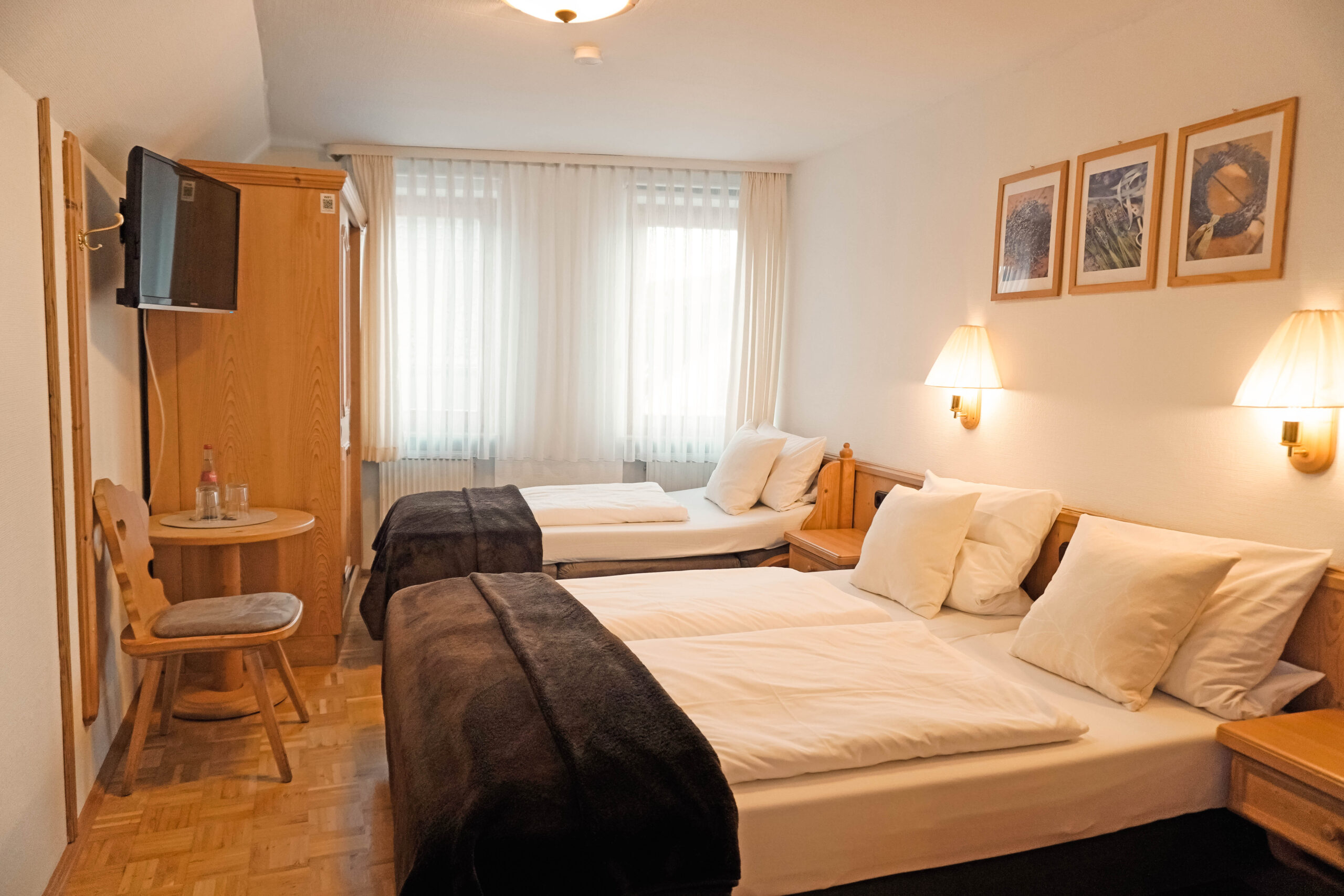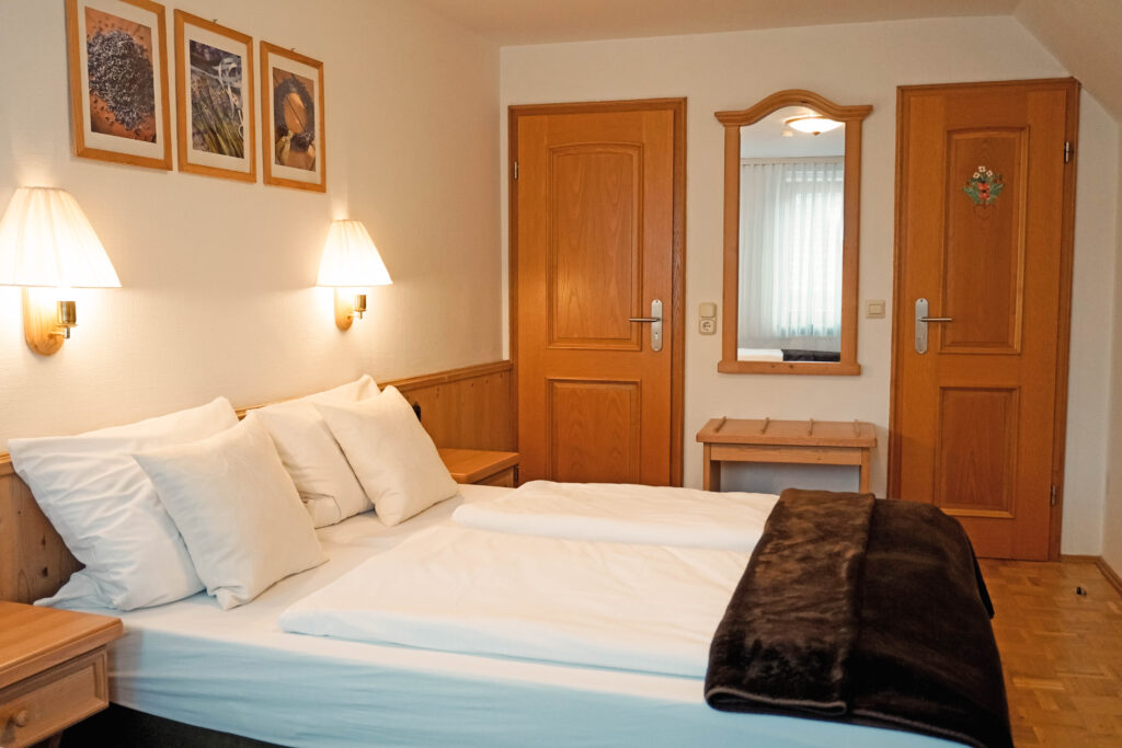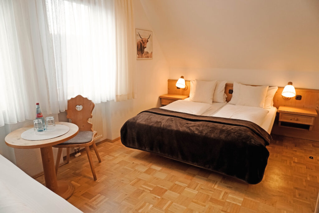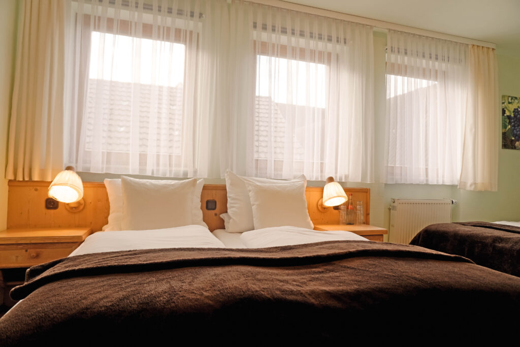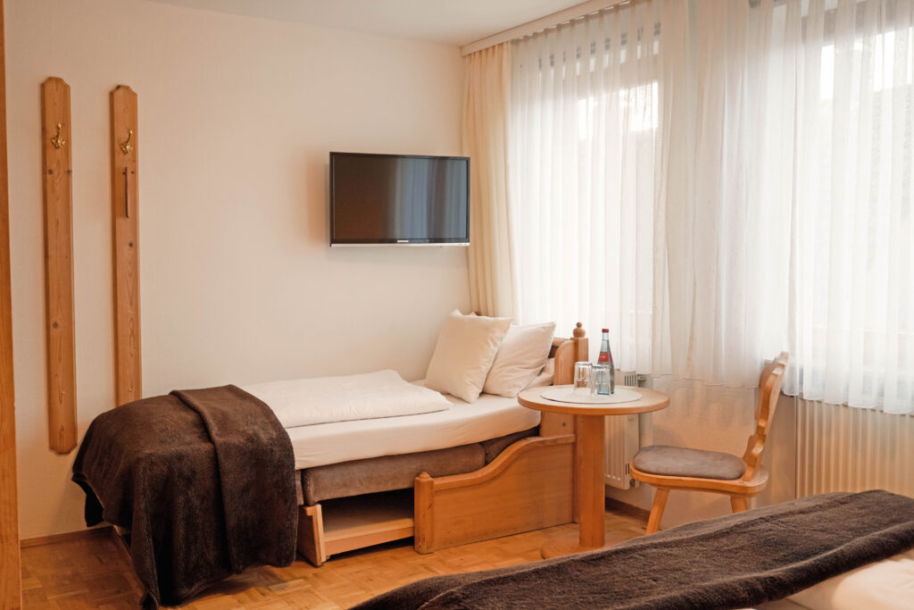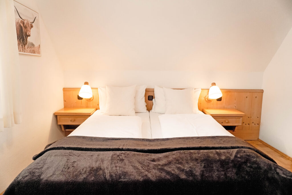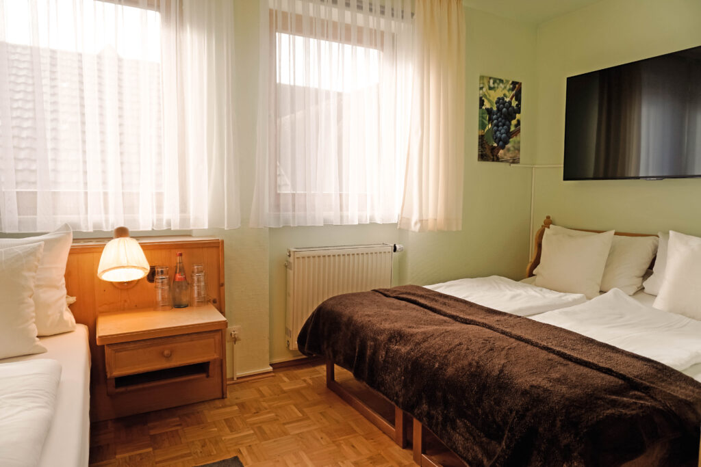 Unsere Mehrbettzimmer basieren auf den Doppelzimmern und sind mit einem oder zwei zusätzlichen Betten buchbar. Sie bieten ausreichend Platz und eine praktische Ausstattung für einen komfortablen Aufenthalt, ideal für Familien oder kleine Gruppen.