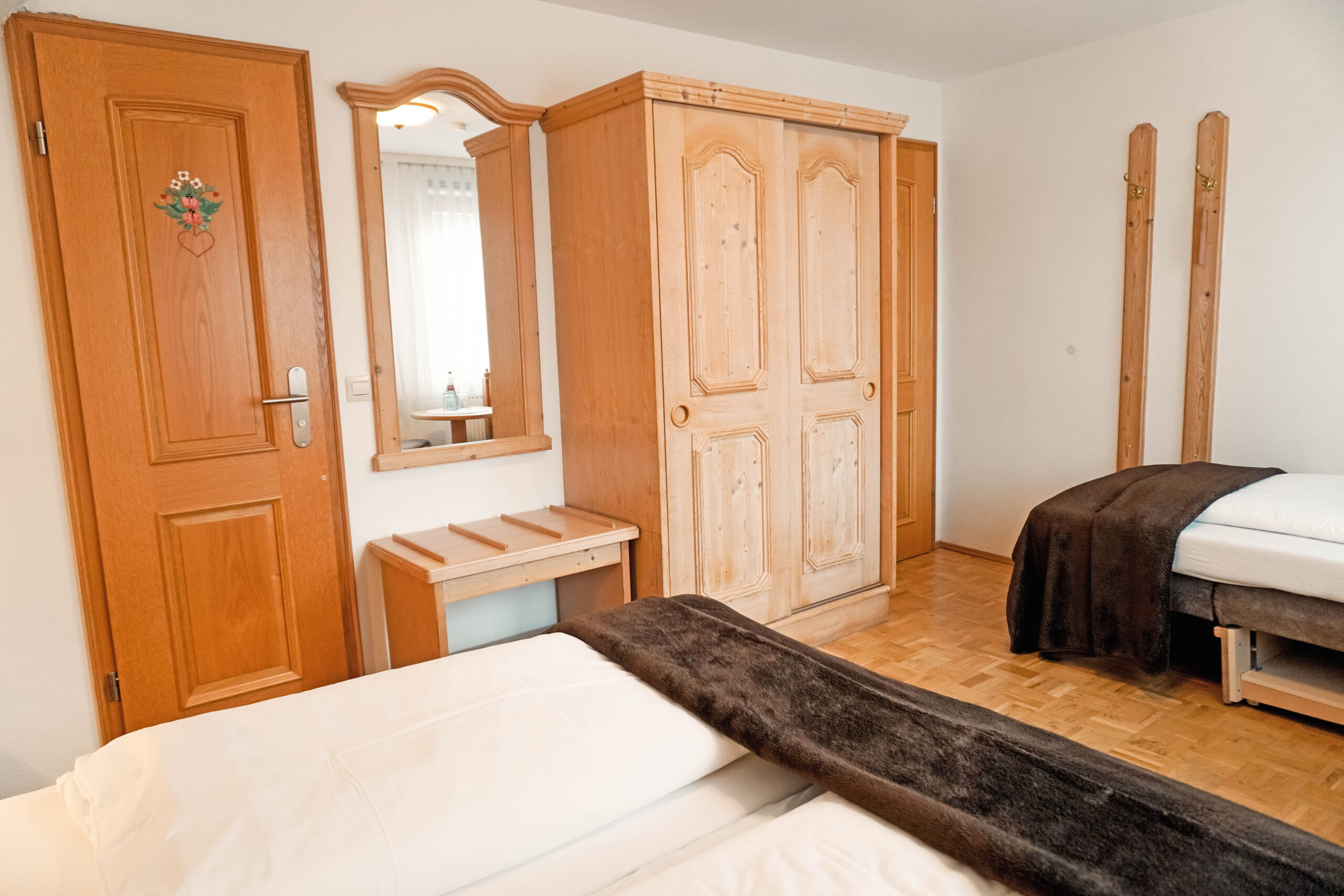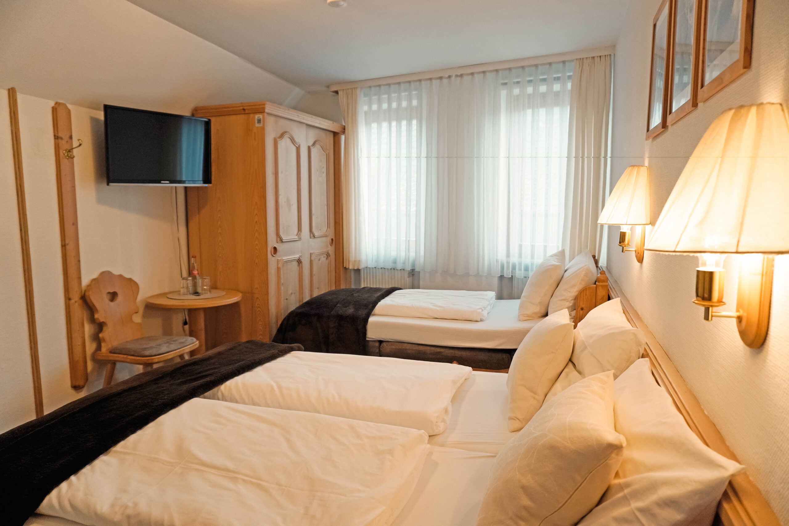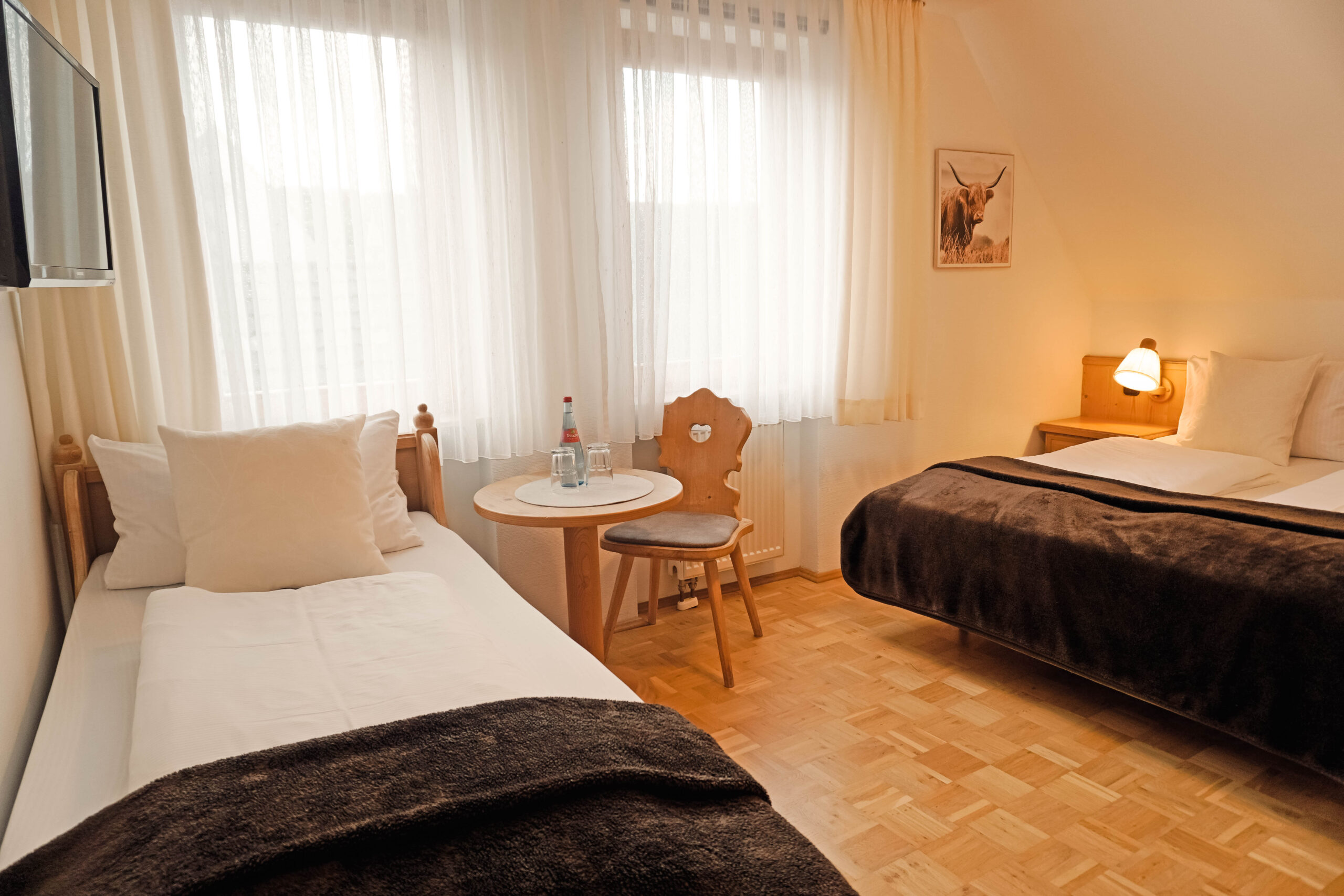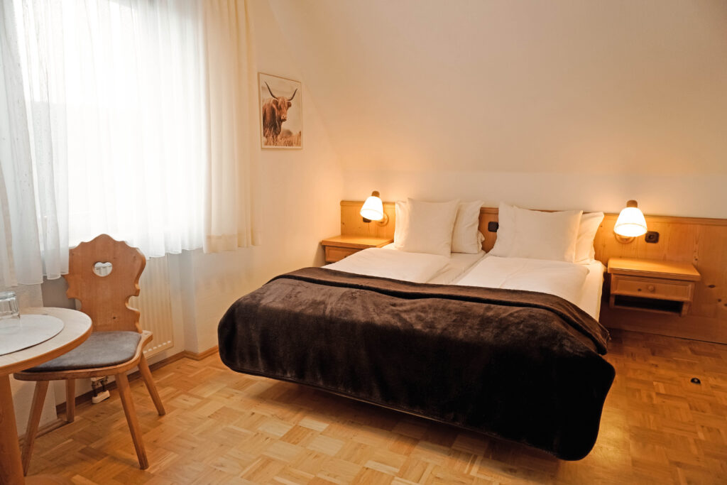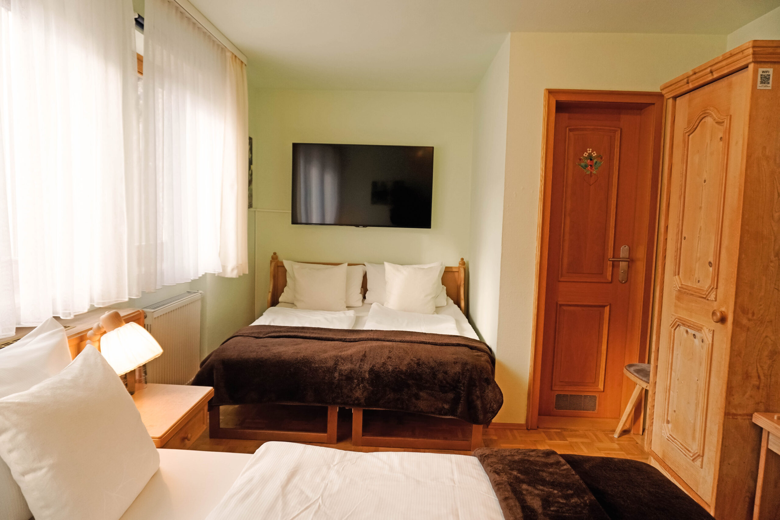 Unsere Mehrbettzimmer basieren auf den Doppelzimmern und sind mit einem oder zwei zusätzlichen Betten buchbar. Sie bieten ausreichend Platz und eine praktische Ausstattung für einen komfortablen Aufenthalt, ideal für Familien oder kleine Gruppen.
